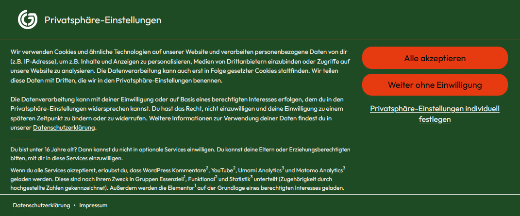 Neben den immensen Geschwindigkeitsverbesserungen, die man gut in den Vergleichsbildern sehen kann, haben wir ein Cookie Banner erstellt, welches dem Design der Website und der Marke angepasst wurde und sich dadurch nahtlos in die Bestandsseite integriert. Alle nötigen Services wurden eingebunden und können nun auf Wunsch des Besuchers auch durch einen Klick deaktiviert werden. Des Weiteren haben wir Jonathans Website in Matomo eingebunden. Dadurch erhält er DSGVO-Konform detaillierte Auswertungen über seine Websitebesucher und kann diese Informationen für zukünftige Projekte nutzen. Auch SEO dar in einem solchen Audit nicht fehlen. Ab sofort zieren passende Bilder und Slogans den Google Eintrag der Website und innerhalb kürzester Zeit stieg die Website in der Google Rangliste auf die ersten Plätze des gewählten Keywords.