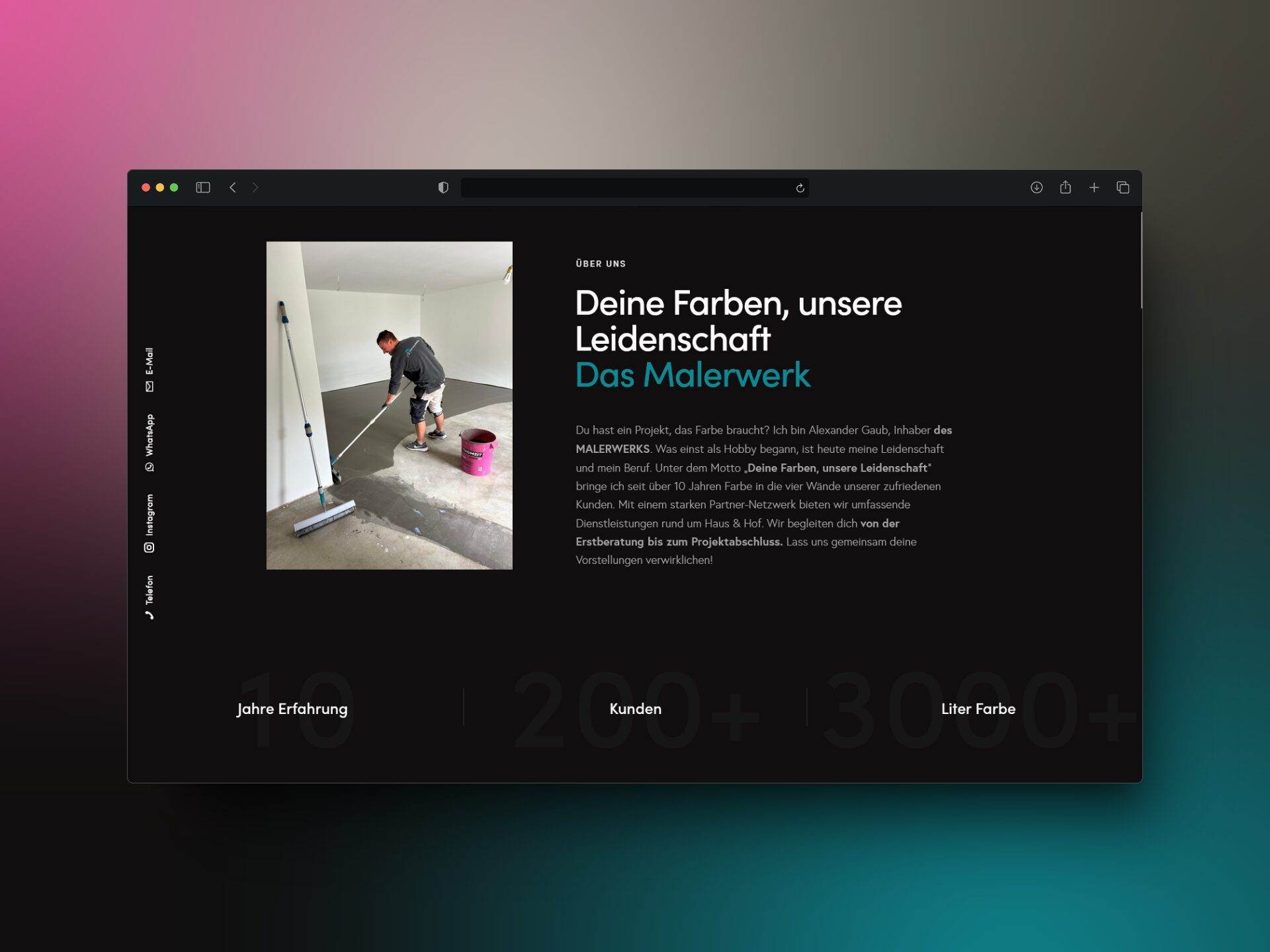 DAS MALERWERK Alexander Gaub, ein renommiertes Unternehmen im Main Kinzig Kreis, beauftragte uns mit der Erstellung einer neuen Website im dunklen Design mit türkisen Akzenten im Corporate Design. Zusätzlich haben wir einen Google-Eintrag erstellt und kleinere kreative Dienstleistungen erbracht. Nach einer ausführlichen Beratung entwickelten wir ein umfassendes Konzept, das die Gestaltung der neuen Website und die Optimierung der Online-Präsenz umfasste. Unser Ziel war es, eine einheitliche und moderne Online-Präsenz zu schaffen, die die Werte und die Identität des Unternehmens widerspiegelt.